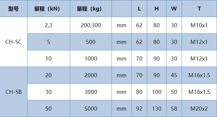 量程:CH-SC:2 kN(200kg)、3 kN(300kg)、5 kN(500kg)、10 kN(1t)