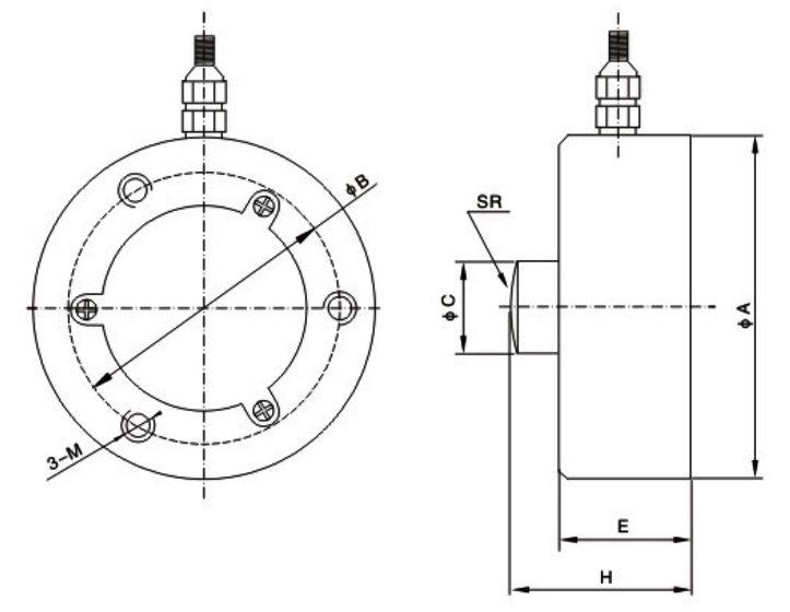 型号 量程(kN) 量程(t) ΦA BΦ ΦC H E M SR TQ-1V 3-10 0.3-1 78 64 15 40 32 M6 40 20-100 2-10 82 66 22 44 32 M8 50 150-300 15-30 127 90 25 70 62 M10 60