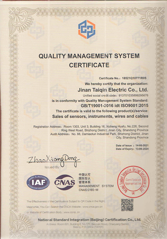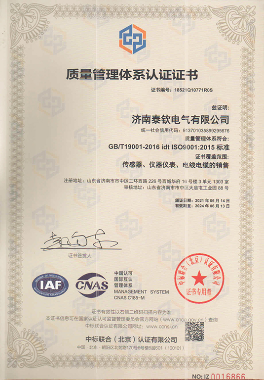 济南泰钦传感器,已通过ISO9001质量体系认证