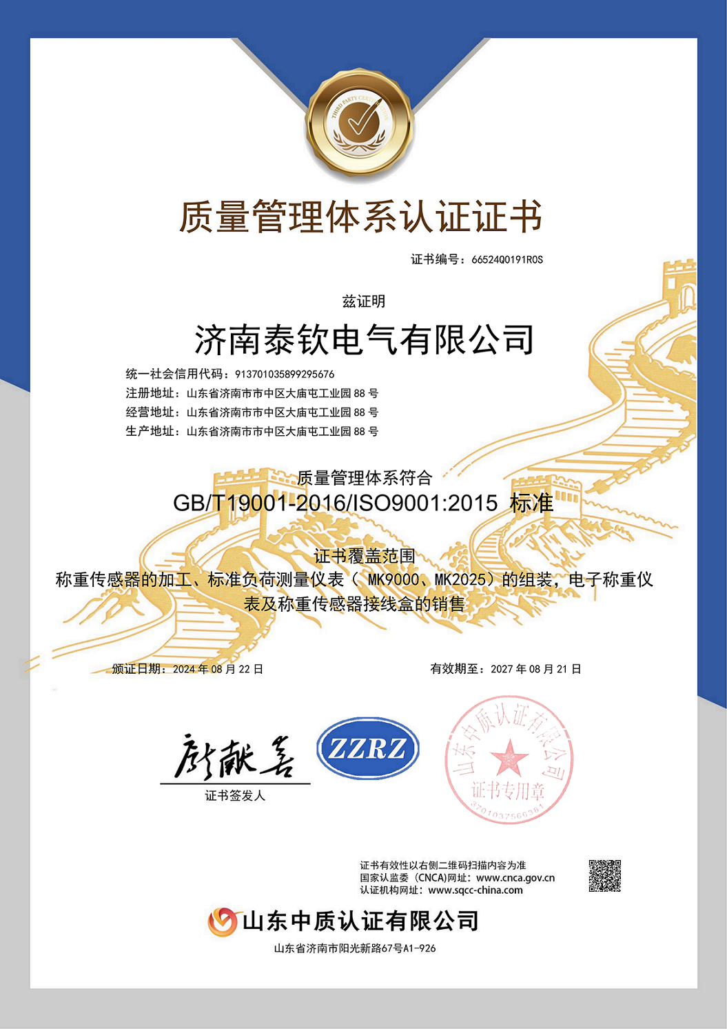 济南泰钦传感器,最新ISO9001质量体系认证证书