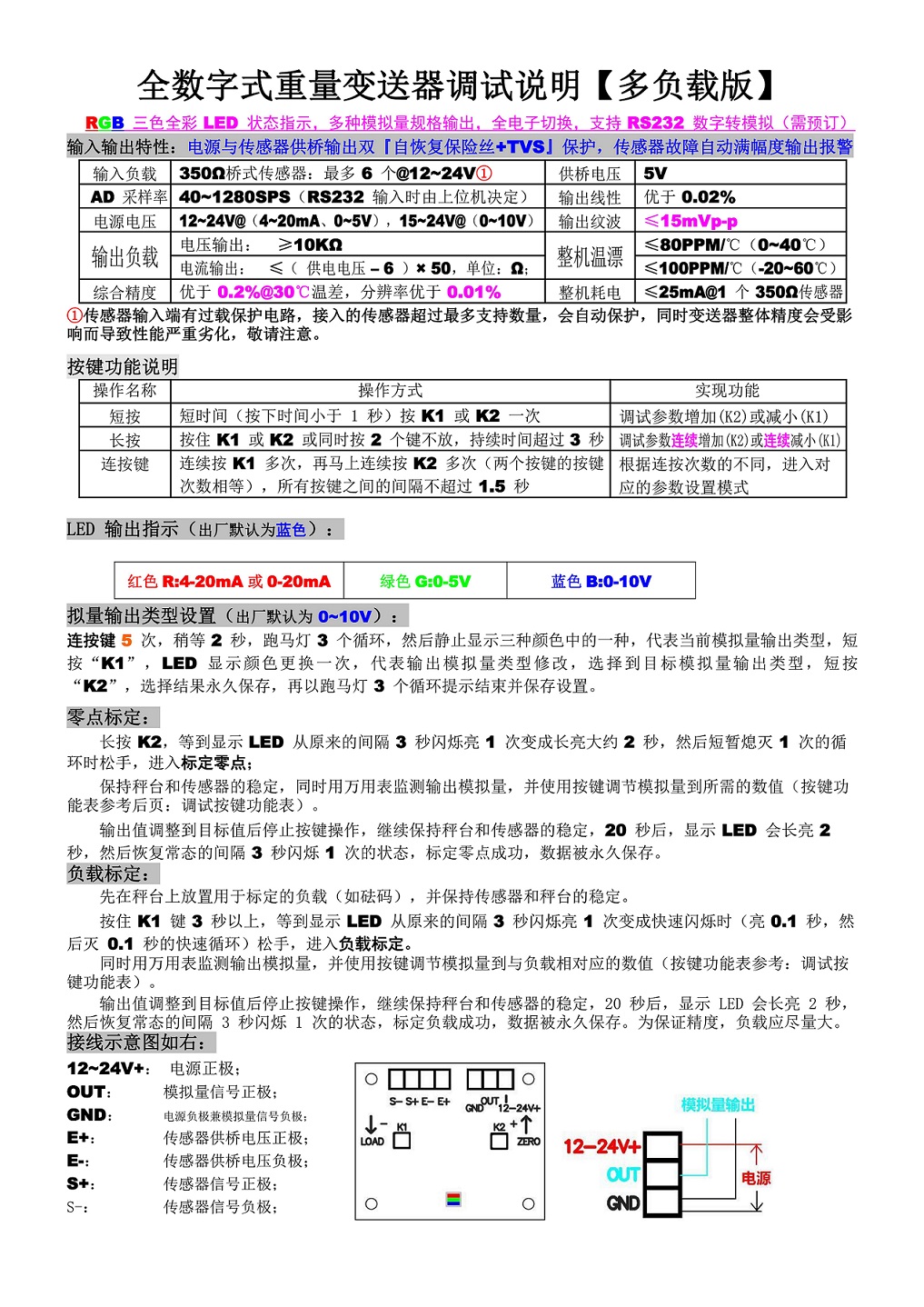 输入输出特性:电源与传感器供桥输出双『自恢复保险丝+TVS』保护,传感器故障自动满幅度输出报警